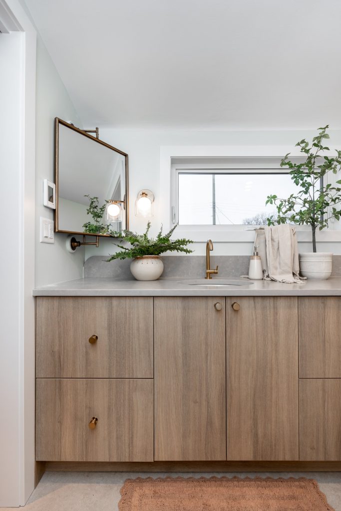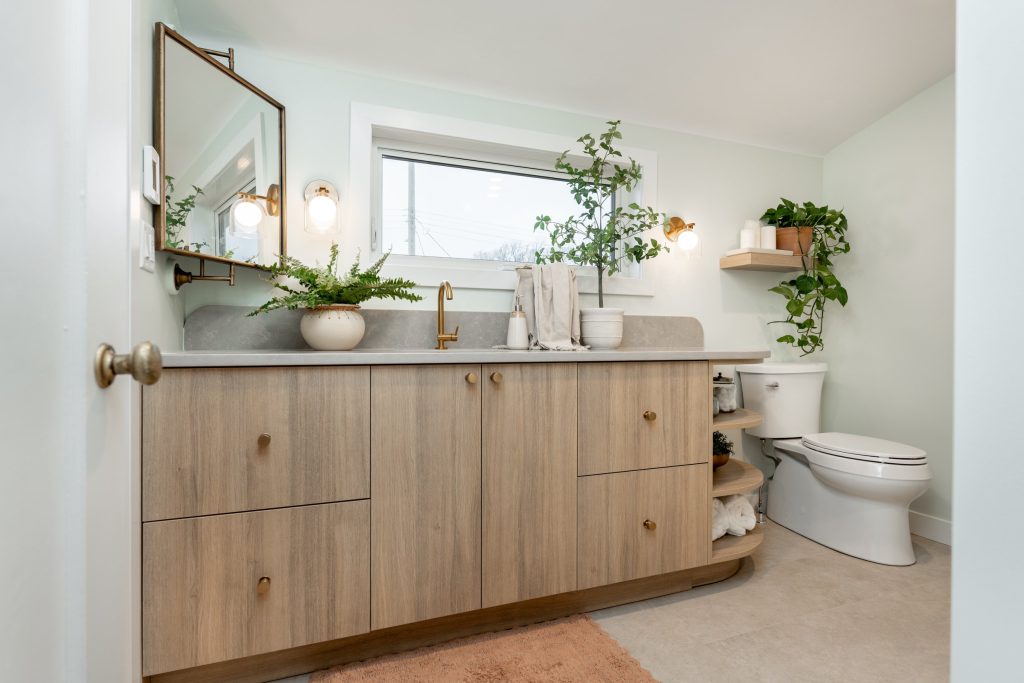 This Braemar bathroom lighting project, completed in collaboration with Grindstone Renovations, features warm, modern lighting that enhances the custom vanity, finishes, and overall functionality of the space.