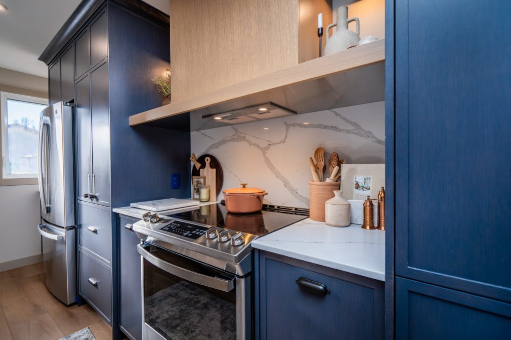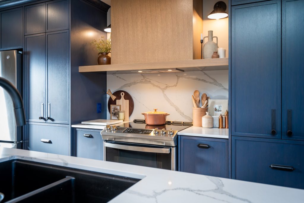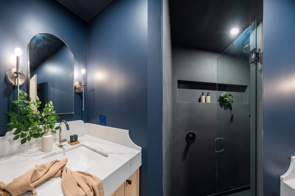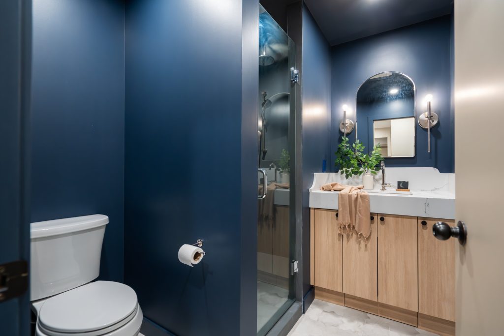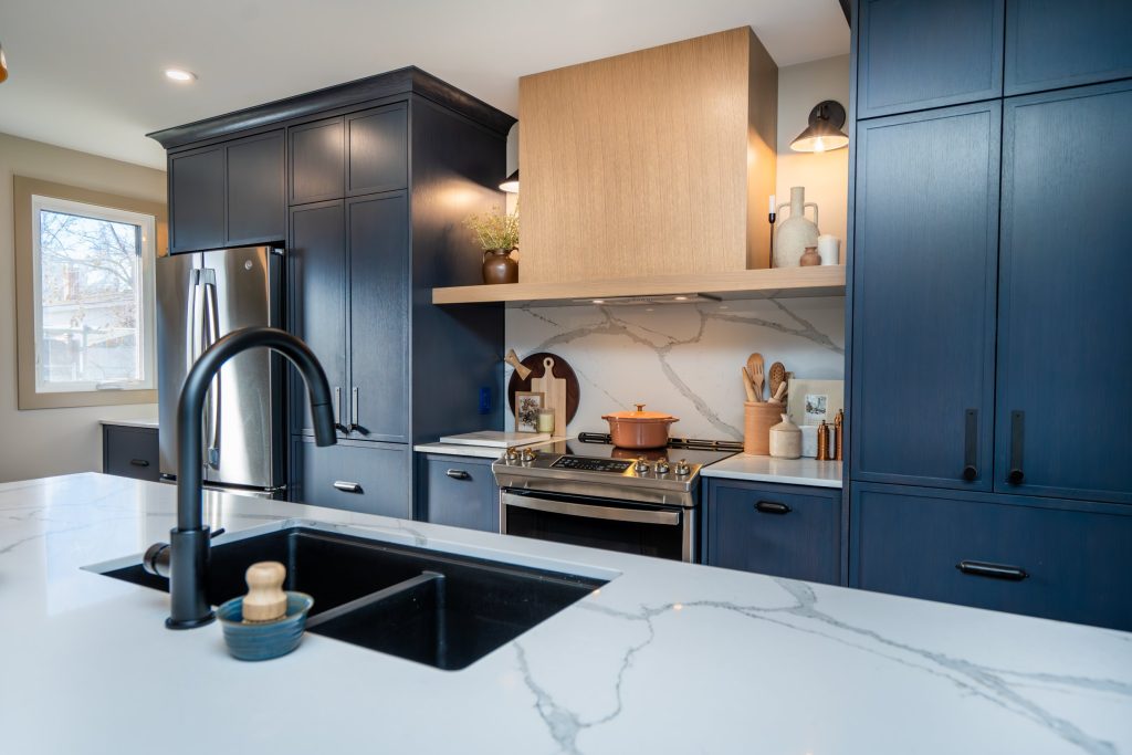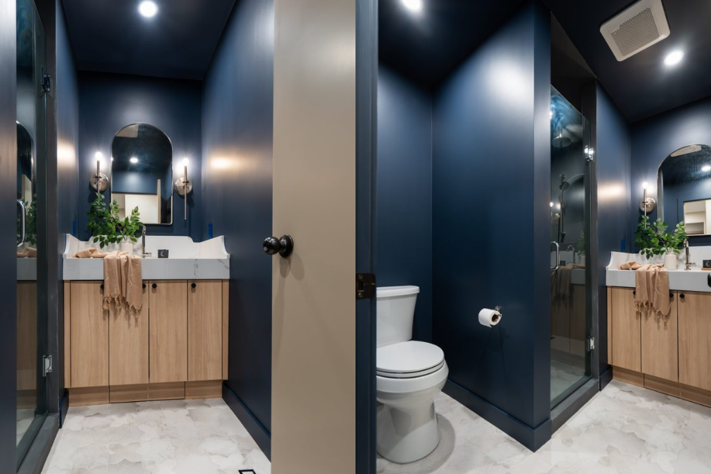 The Fritzgerald Project by Grindstone Renovations, lit by Robinson Lighting, layers modern kitchen and bath lighting for a warm, high-function home. Matte-black pendants anchor the island, low-glare LED recessed lights brighten work zones, and a compact sconce niche adds cozy task light. Over the range, under-shelf LEDs and range hood lighting highlight the quartz backsplash, while the bathroom combines damp-rated recessed lighting with brushed-nickel wall sconces for flattering, even illumination. Thoughtful fixture placement, dimming, and colour-consistent LEDs create clean lines, rich navy cabinetry contrast, and a welcoming glow—proof that layered lighting elevates everyday living.
