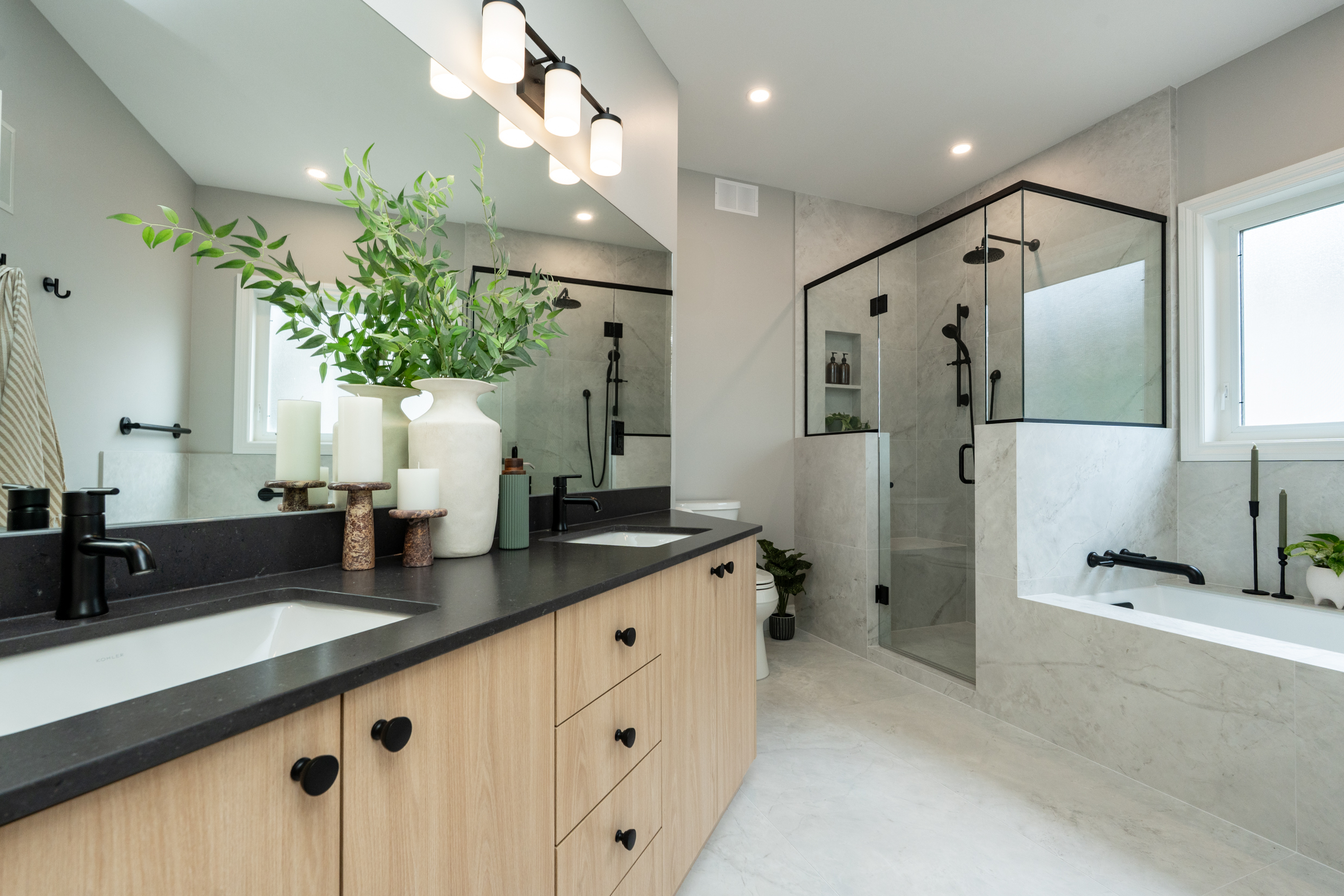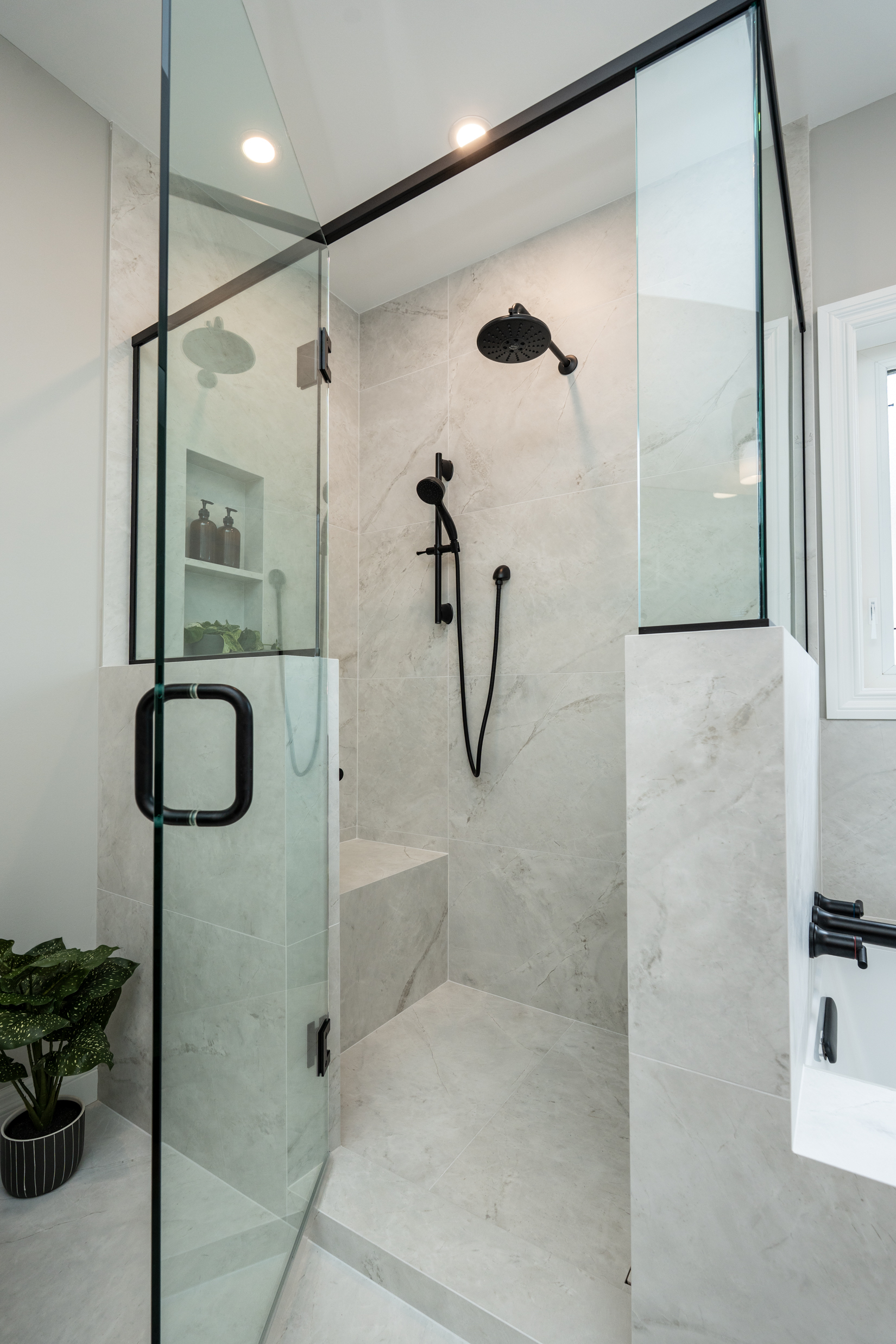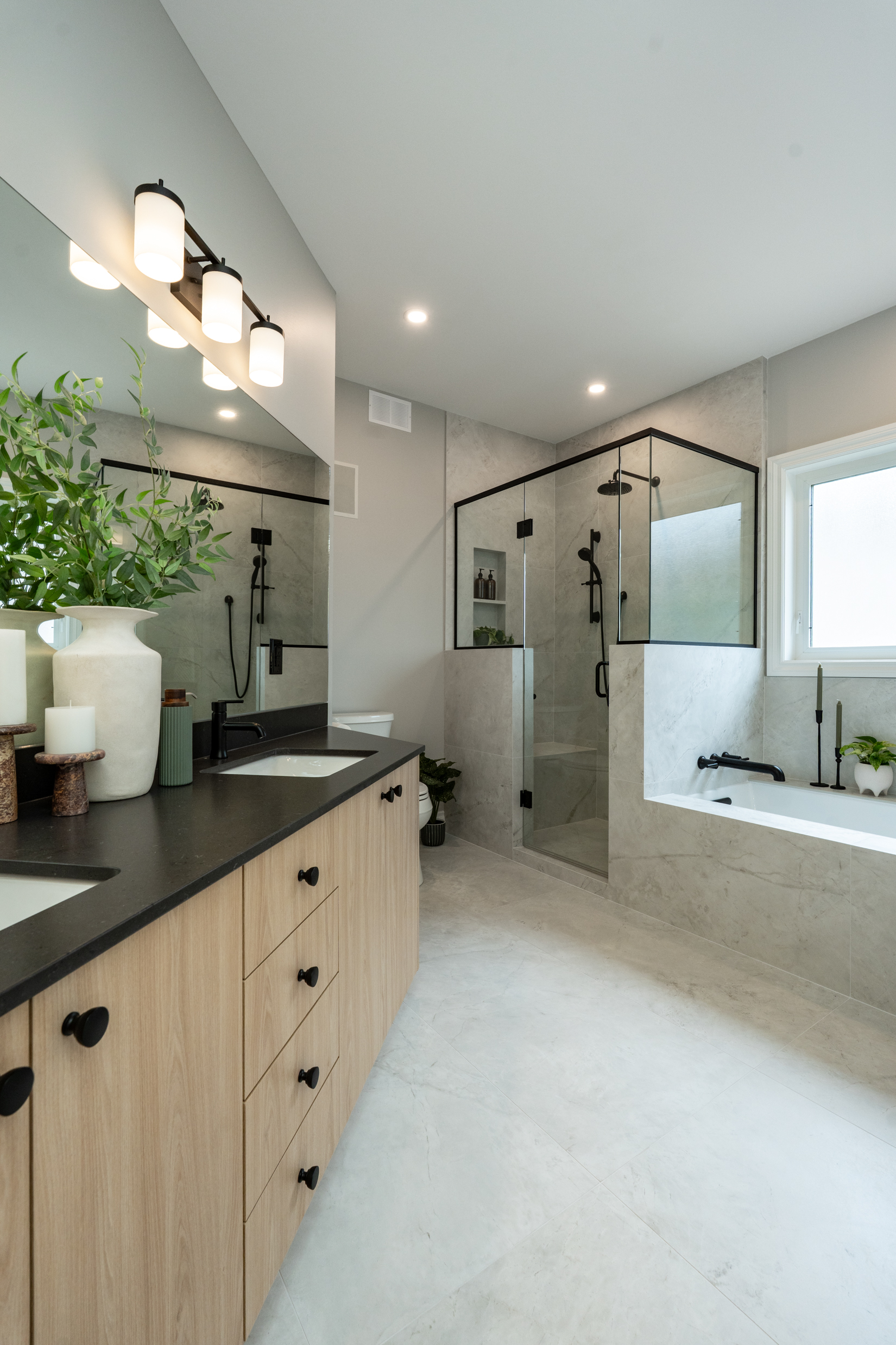 The Georgetown Lighting Project Winnipeg showcases a modern residential lighting plan designed to enhance functionality and architectural detail. This Winnipeg home features layered bathroom lighting, including vanity fixtures, recessed ceiling lights, and ambient shower illumination curated by Robinson Lighting Centre.
