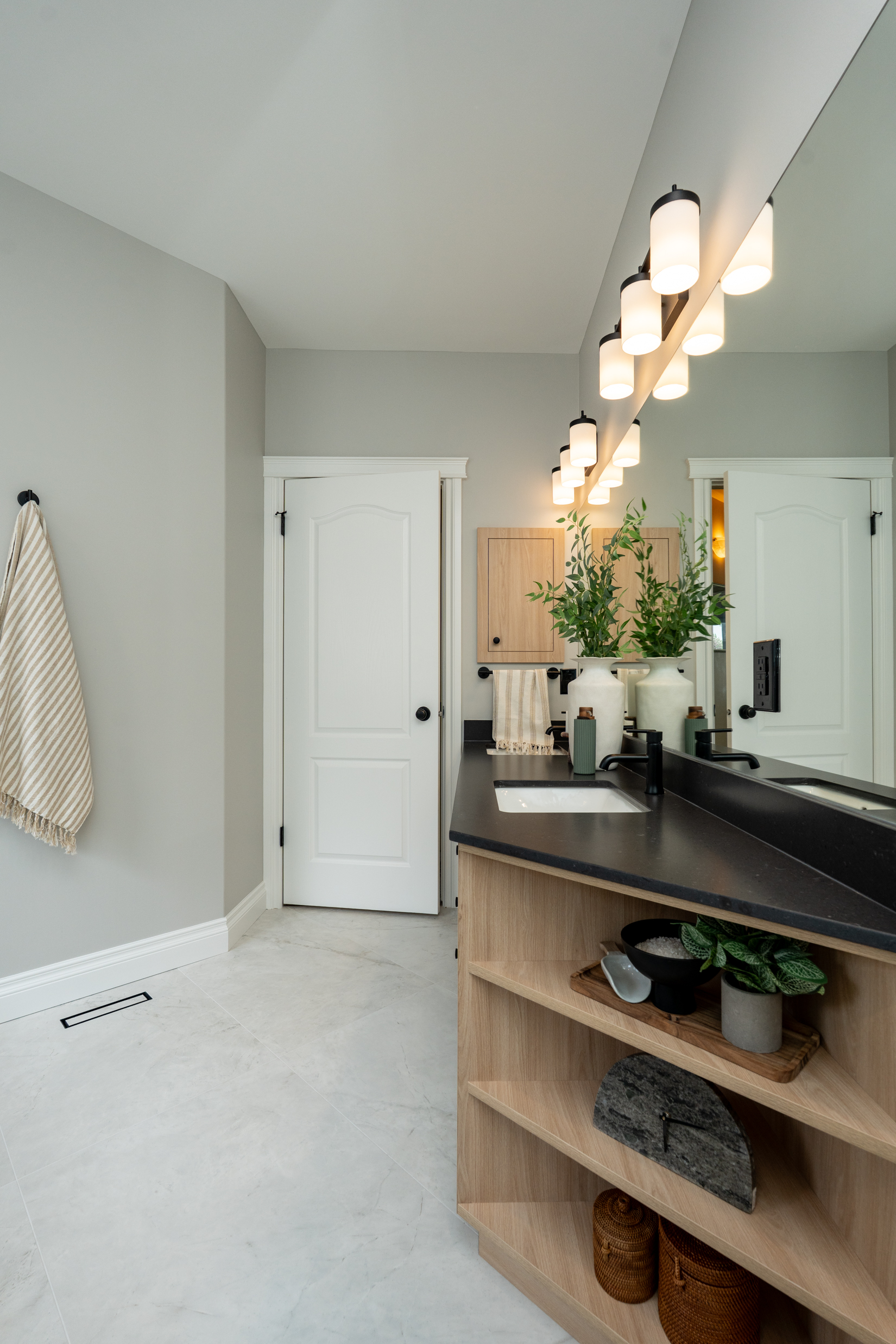 The project features modern vanity lighting, recessed ceiling lights, and moisture-rated fixtures for shower and tub areas.