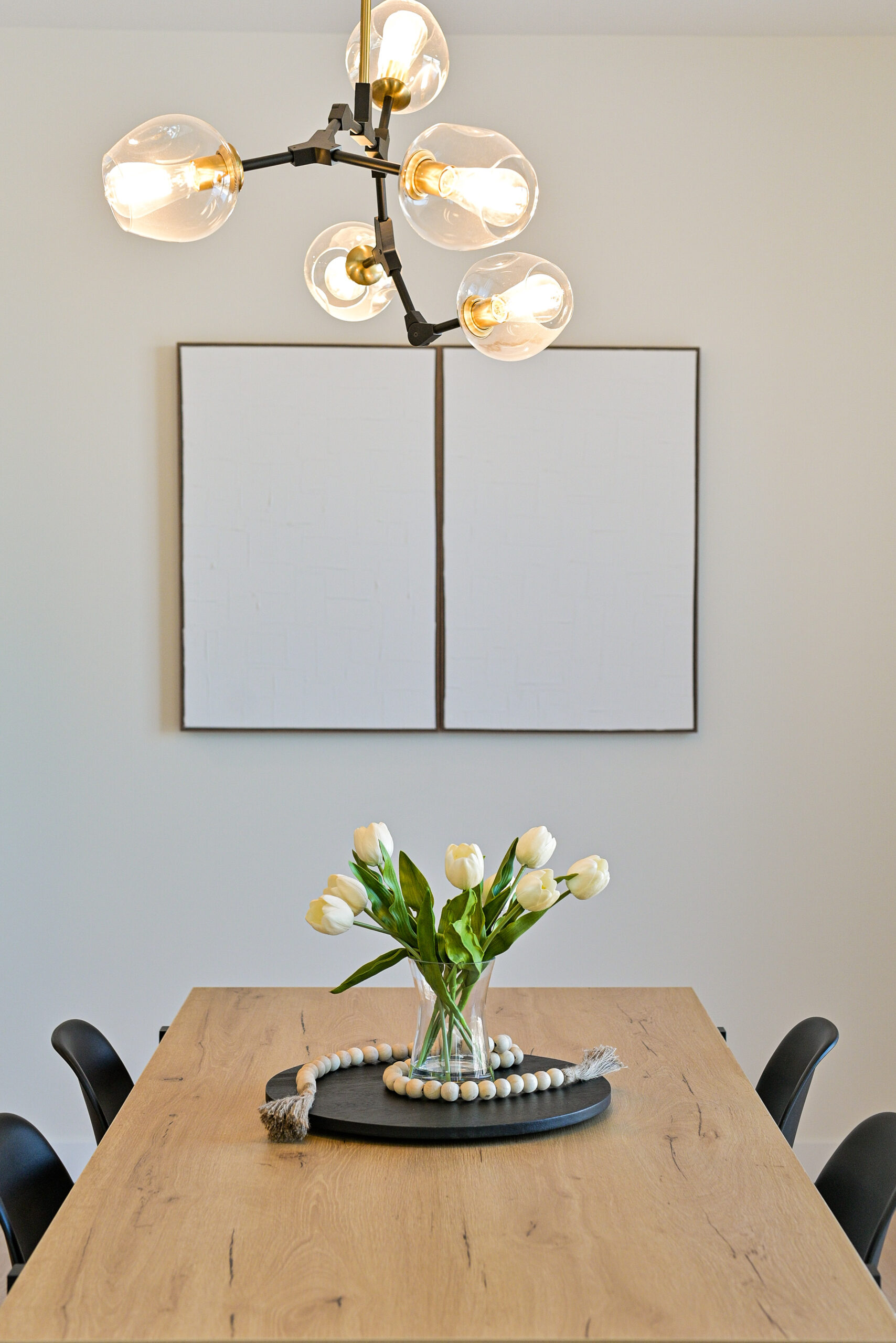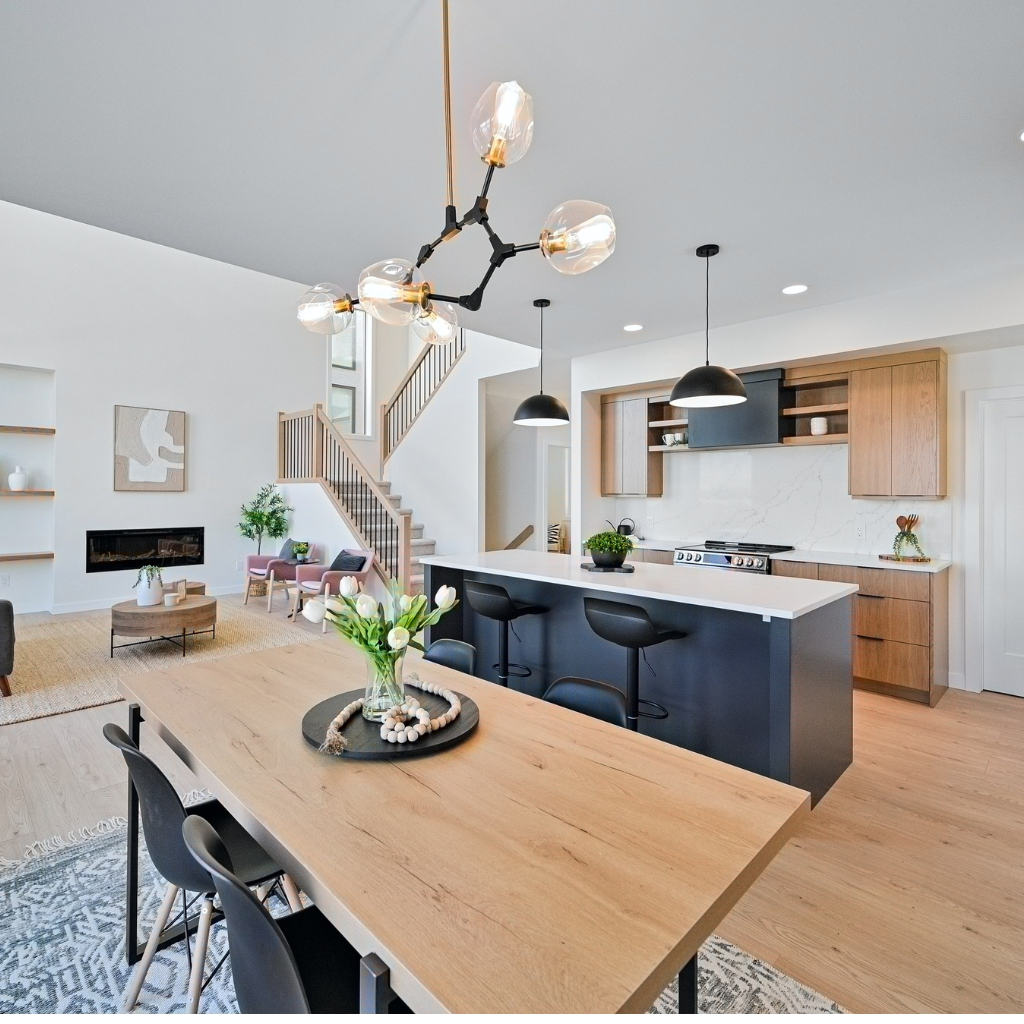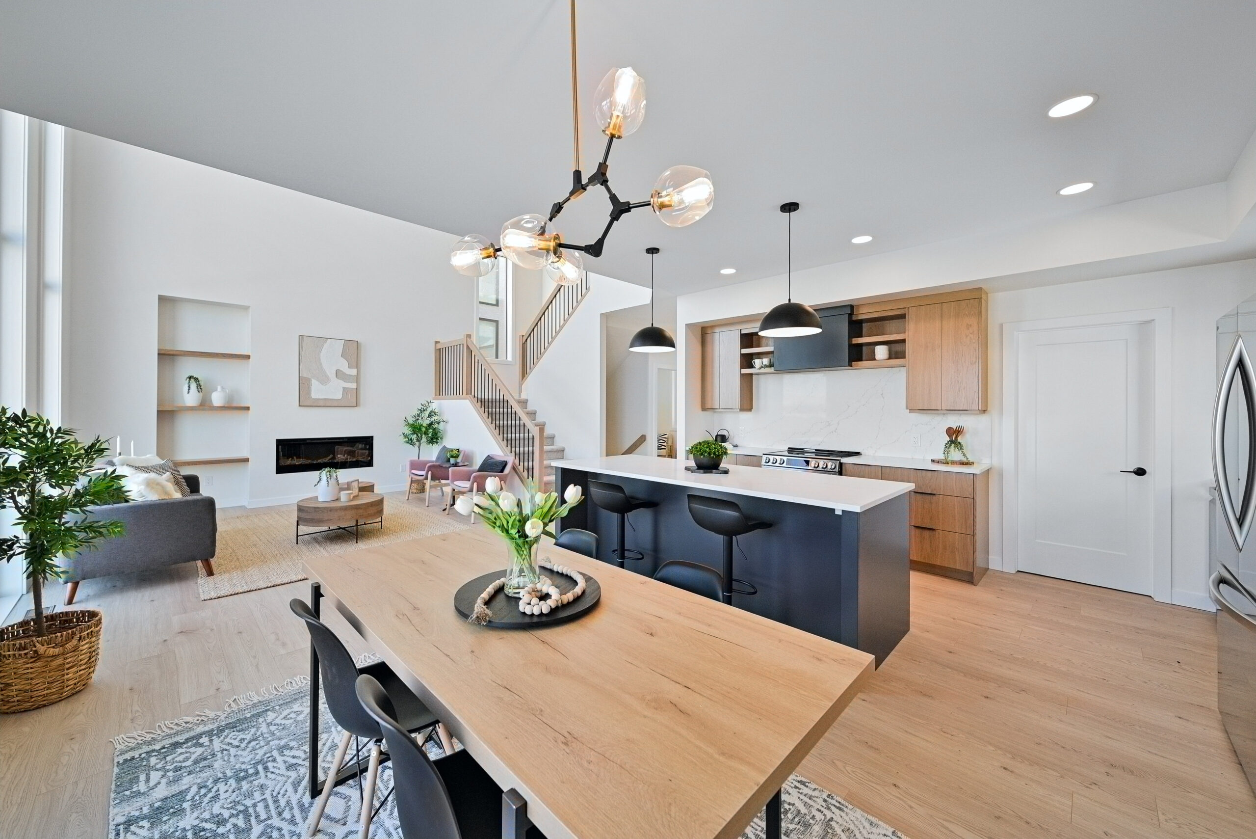 A sculptural chandelier anchors the dining area, adding warmth and style while defining the space within the open-concept layout.