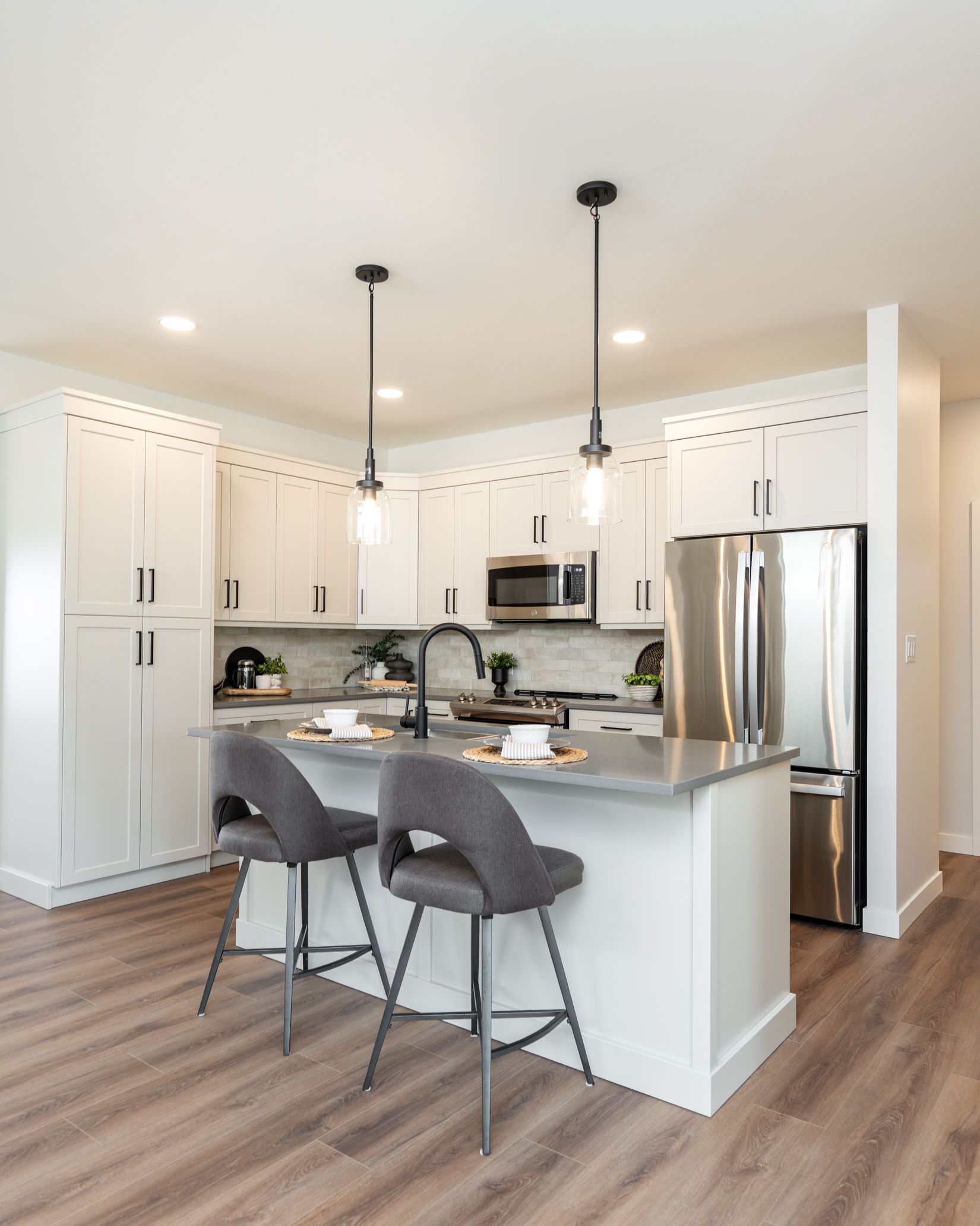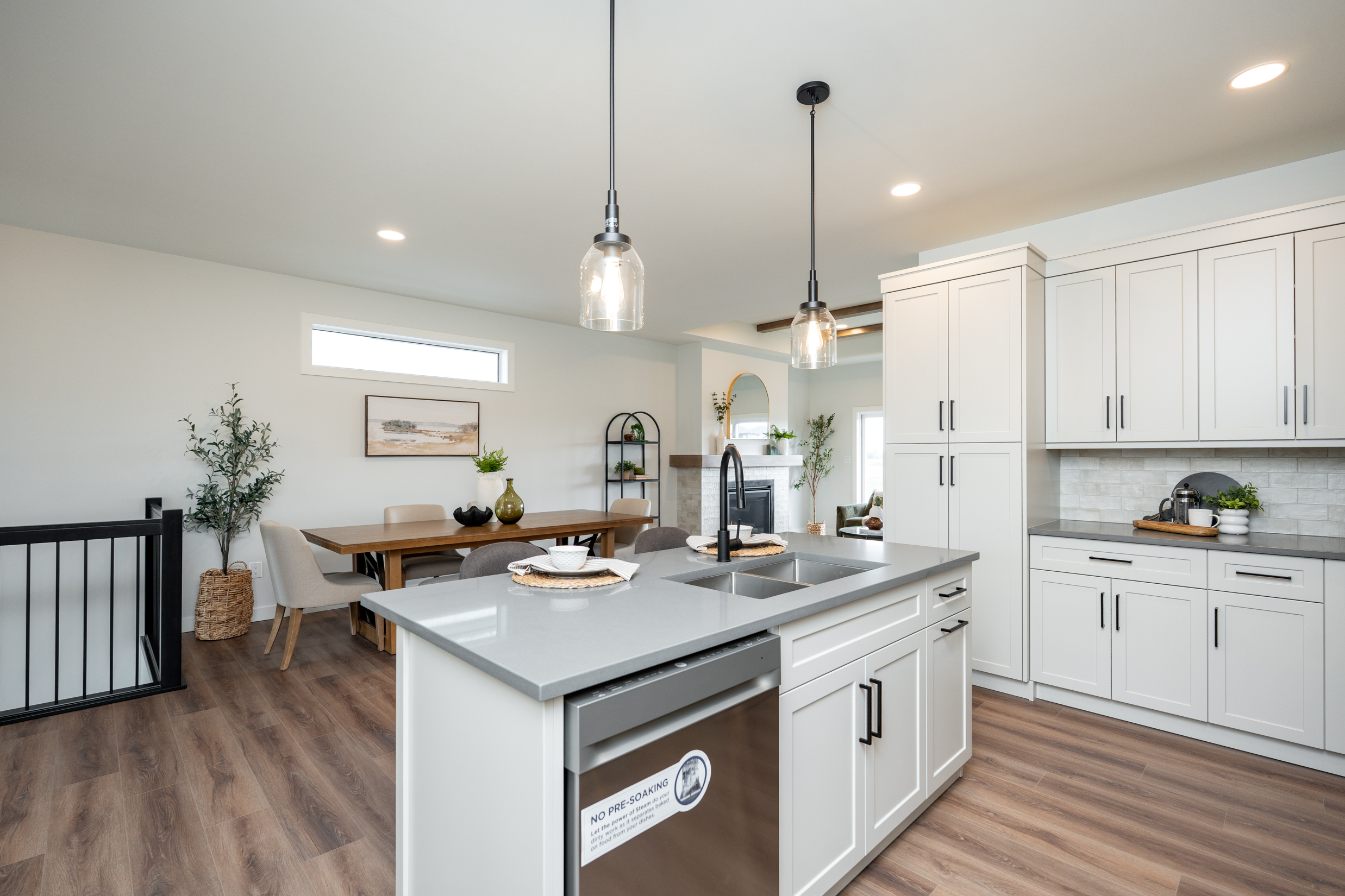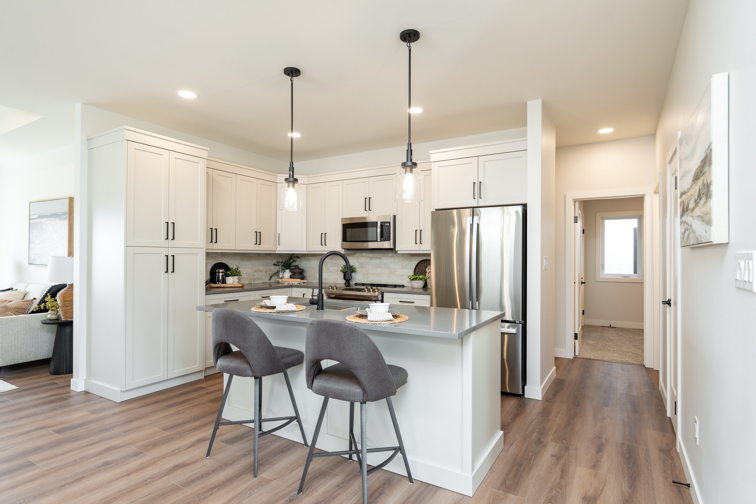 This project at Woodland Way reflects current trends in Winnipeg home design, including clean-lined pendant lighting, layered illumination, and functional layouts that support everyday living.